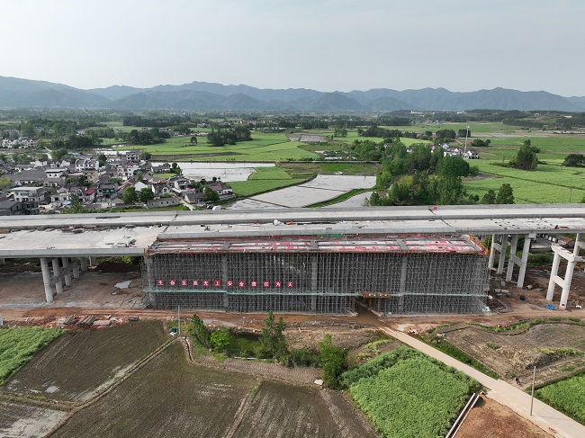 泾青高速一分部包含现浇梁11联,砼方量8343.6m³,梁宽10.0m-24.149m,梁高1.6-1.8m,均为变截面结构形式,梁下墩柱高6.8m-23.4m,均采用Z型盘扣式满堂支架施工。现浇梁结构形式复杂,安全风险高,施工难度大,是本项目的控制性关键工序。为确保现浇梁顺利浇筑,项目部明确分工、精心组织、不断优化打磨专项施工方案并通过专家评审,提前对浇筑工艺、安全、质量等进行全面交底。施工过程中,项目部主要人员现场督导,对支架搭设、模板安装、钢筋绑扎、混凝土浇筑、配合比、振捣、养护等各个环节严格把控,克服了基础软弱、高满堂支架、涉乡道门洞搭设等多项技术难题,规避了满堂支架搭设、模板安装、混凝土浇筑等过程中的安全风险,确保了现浇梁浇筑的圆满顺利完成。