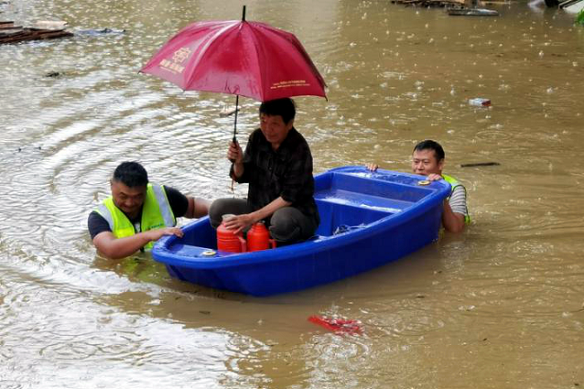 项目部全体党员冲锋在前,在道路损毁、无法通行的情况下,克服重重困难,自制塑料船和竹筏,前往武阳村对受困村民开展转移救援行动。