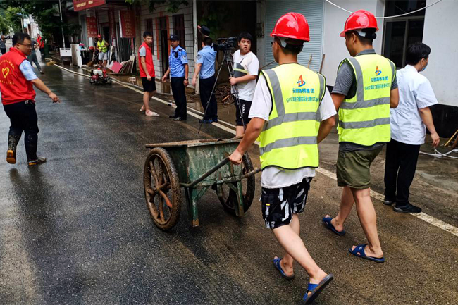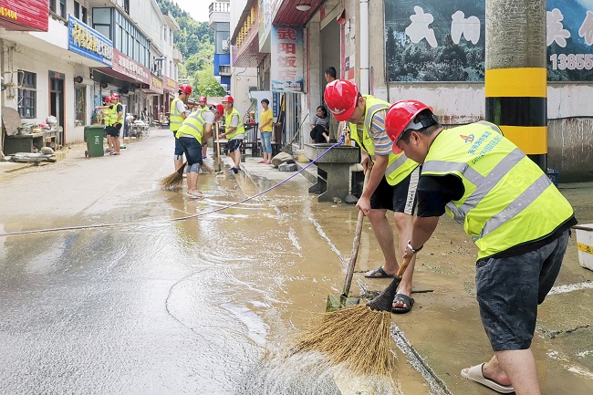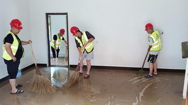 7月9日,洪水退后,当地政府组织灾后自救工作。项目部再一次集体出动,深入受灾现场,积极主动参与武阳村及武阳乡街道灾后恢复工作。