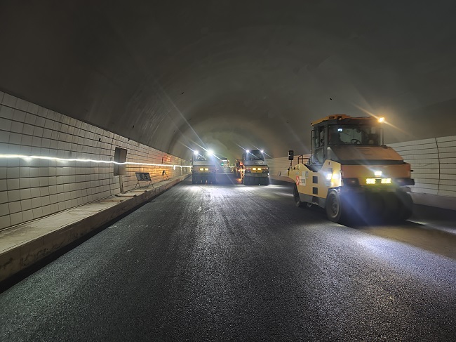 本次摊铺的沥青为上面层,位于牛山尖隧道K0+800~K1+400右洞,设计采用AC-13C细粒式SBS改性沥青混凝土,厚4cm,长600m,宽12.5m,摊铺面积7500㎡,共计使用沥青混合料720吨。