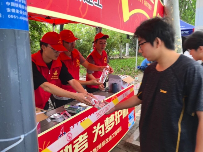 淮扬高速06标项目和G328定远段项目在定远二中考点前搭建起爱心服务站,为考生和家长提供矿泉水、文具等各类物资。