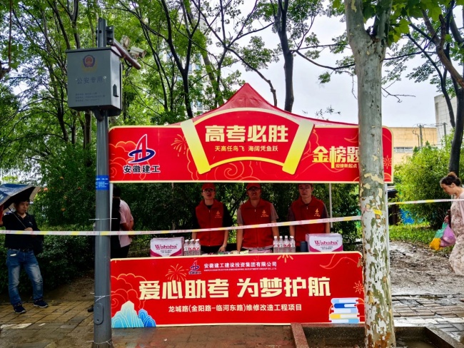 龙城路(金阳路-临河东路)维修改造工程项目部志愿者们在合肥市通用技术学校考点外搭建遮阳棚,为考生们和家长提供临时休息区,温馨提醒往来考生检查考试必需品及相关证件,还准备了多品类文具、饮用水、纸巾等,以备考生不时之需。