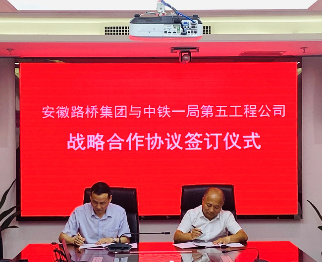 8月1日上午,安徽路桥集团与中铁一局五公司战略合作签约仪式在合肥举行。公司党委书记、董事长盛明宏与中铁一局五公司党委书记、执行董事梁战喜代表双方签订战略合作协议。