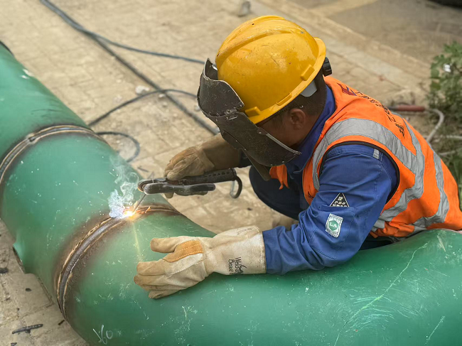 庐江县龙桥镇污水处理厂提质升级EPC项目现场焊花飞溅,工人师傅头戴安全帽、身着工装,专注焊接管道。汗水顺着脸颊滑落,浸透衣衫,他们以专业与坚守,在酷热中筑牢城市建设的根基。目前,龙桥大道管廊管道施工完成70%。