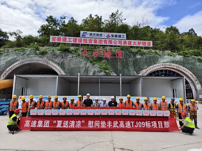 8月13日,重庆高速集团二级专务何桂文,重庆成渝垫丰武高速公路有限公司党委副书记、纪委书记、工会主席张莉筠一行深入建工建投垫丰武高速TJ09标段火炉隧道施工现场,开展“送清凉”活动。