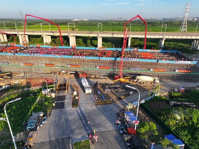 本次浇筑的首联现浇箱梁为主线第二联上跨柏堰湾路桥,跨径组合为35m+65m+35m,联长135米,梁顶宽25.6米,底宽19.6米,变截面梁高2~4米,设计混凝土方量达3593.2立方米。其中顶板混凝土1593.2立方米,本次完成底腹板浇筑2000立方米,混凝土设计等级C50,施工精度和工艺要求极高。