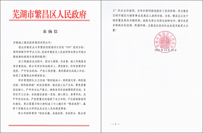 近日,芜湖市繁昌区人民政府向建工建投集团发来表扬信,对安农大繁昌创新港项目顺利实现“920”投用目标,保障开学节点如期达成作出的积极贡献致以诚挚感谢。