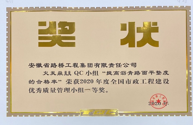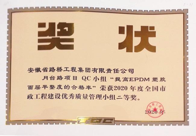 选送的3项QC成果中,公司新基建QC小组“提高白加黑道路板块处理一次检测合格率”和火炎焱燚QC小组“提高沥青路面平整度的合格率”两项作品荣获2020年全国市政工程建设优秀质量管理小组一等奖,月台路QC小组“提高EPDM塑胶面层平整度的合格率”荣获二等奖。