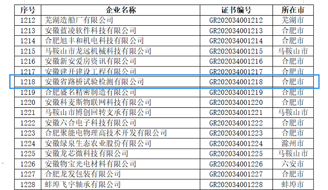 2020年12月4日,安徽省路桥试验检测有限公司(简称“检测公司”)荣获安徽省2020年度第一批“高新技术企业”认定资格(证书编号GR202034001218),成为安徽省路桥工程集团有限责任公司二级机构第一家高新技术企业,标志着检测公司的企业技术实力和科研成果获国家认可,正式迈入国家高新技术企业行列。