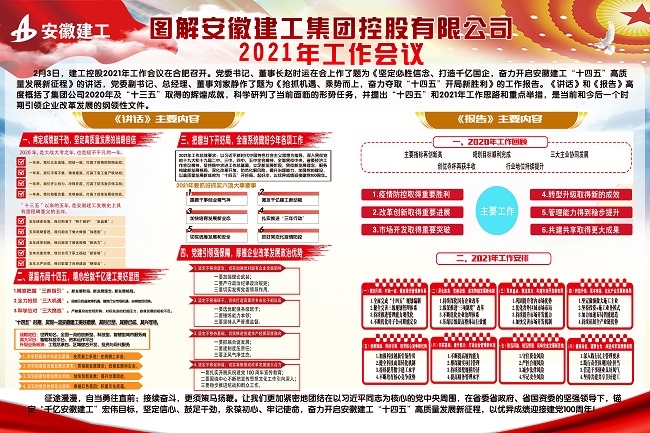 赵时运指出,2020年是大战大考之年,也是安徽建工发展历程中极不平凡的一年,在省委省政府、省国资委的坚强领导下,集团上下保持战略定力,精心谋划部署,果断采取行动,奋力攻坚克难,打好打赢了疫情防控阻击战、复工复产联动战、防汛救灾保卫战和改革发展收官战“四场硬仗”,全面超额完成年度目标任务,为“十三五”划上圆满句号,交出了优异答卷。