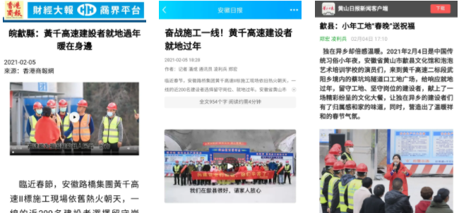 临近春节,安徽路桥集团黄千高速Ⅱ标施工现场依旧热火朝天,一线近200名建设者选择留守岗位、就地过年。安徽省黄山市歙县的文艺志愿服务小分队和项目驻地的武阳乡党委政府组织了多种形式的慰问服务活动,给广大就地过年的建设者送上新春祝福。《安徽日报》、《香港商报》、《黄山日报》对此进行了相关报道。