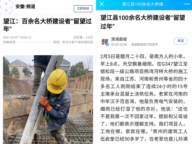 近日,新华社、《潇湘晨报》对安徽路桥集团G347安九二期望江至宿松段一级公路工程项目的100余名大桥建设者“留望过年”进行了相关报道。