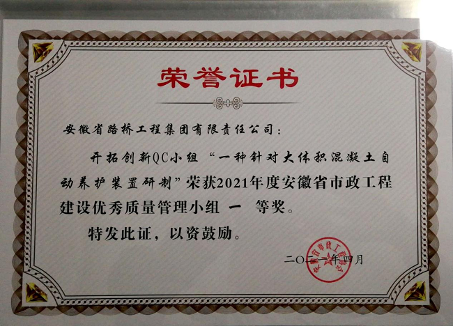 近日,从安徽省建设行业质量与安全协会及安徽省市政协会传来喜讯,安徽路桥集团四分公司祁门EPC项目QC小组完成的《一种针对大体积混凝土自动养护新型装置研制》荣获安徽省建筑企业2021年QC小组成果发布会一等奖、安徽省市政工程建设优秀质量管理小组一等奖,《提高预制梁外观验收合格率》荣获安徽省建筑企业2021年QC小组成果发布会二等奖,同时准备申报中国市政协会QC优质成果。