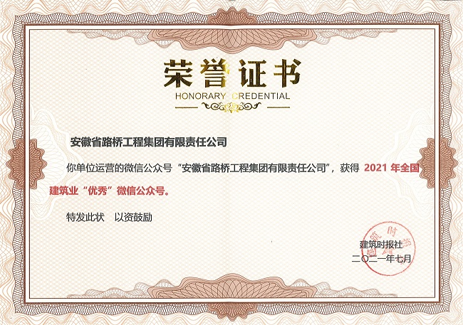 7月16日,2021年建筑业微信公众号运维经验交流研讨会暨全国建筑业优秀公众号颁奖典礼在江苏扬州举行。公司微信公众号“安徽省路桥工程集团有限责任公司”(微信号:ahlqjt)再获“全国建筑业优秀微信公众号”荣誉称号。