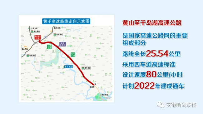 黄山至千岛湖高速公路是国家高速公路网的重要组成部分,路线全长25.54公里,采用四车道高速标准,设计速度80公里/小时,计划2022年建成通车。