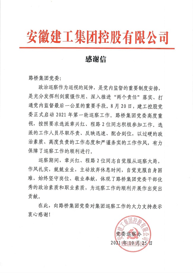 近日,建工控股党委巡察办发来感谢信,对公司在集团开展的2021年第一轮巡察工作期间,提供的高质量服务保障和作出的突出贡献表示感谢。