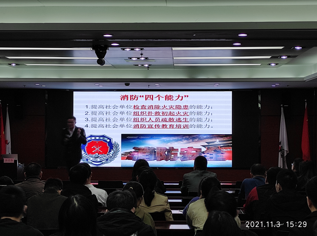 在“11.9”全国消防安全宣传日来临之际,为普及消防安全知识,提升消防安全意识,11月3日,公司于8楼会议室举办消防安全知识讲座。政安防火教育中心张守伟教官应邀授课。
