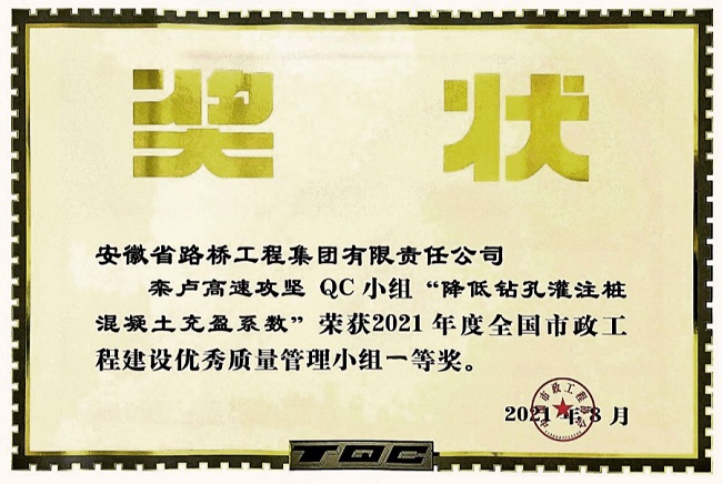 11月1日至11月3日,在由中国市政工程协会举办的2021年度广州赛区全国市政工程建设优秀QC成果交流会上,栾卢高速03标项目攻坚QC小组的“降低钻孔灌注桩混凝土充盈系数”成果荣获2021年度全国市政工程建设优秀质量管理小组一等奖。