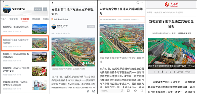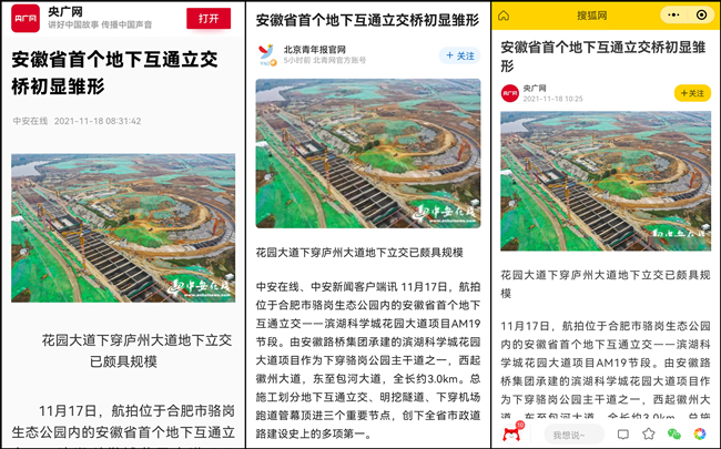 11月18日,安徽惟一重点新闻门户网站——中安在线于首页头版位置以《安徽省首个地下互通立交桥初显雏形》为题,以图文形式,聚焦安徽路桥集团滨湖科学城花园大道项目施工进展情况,对项目创下全省市政道路建设史上的多项第一予以重点报道。稿件随后被学习强国、人民日报客户端、人民网、央广网、北青网、腾讯网、新浪网等多家主流媒体转载发布,路桥集团建设者攻坚克难,斗志昂扬的良好精神风貌被予以细致描绘,公司良好企业形象得到进一步彰显。