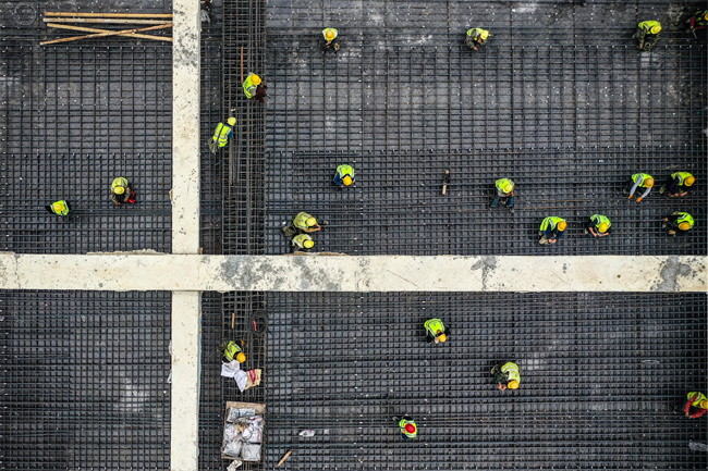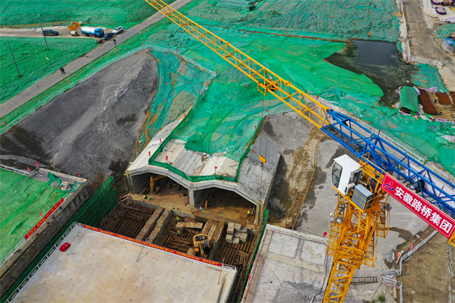 在安徽路桥集团承建的滨湖科学城花园大道项目工地上,记者看到塔吊林立,车辆来回穿梭,机器轰鸣作响,几十名施工人员正紧锣密鼓地进行中板钢筋绑扎作业。