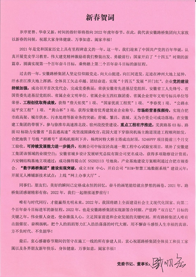 岁序更替、华章又新,时间的指针即将指向2022年虎年春节。在此,我代表安徽路桥集团向大家致以新春的问候,祝愿大家身体健康、万事如意、阖家幸福!