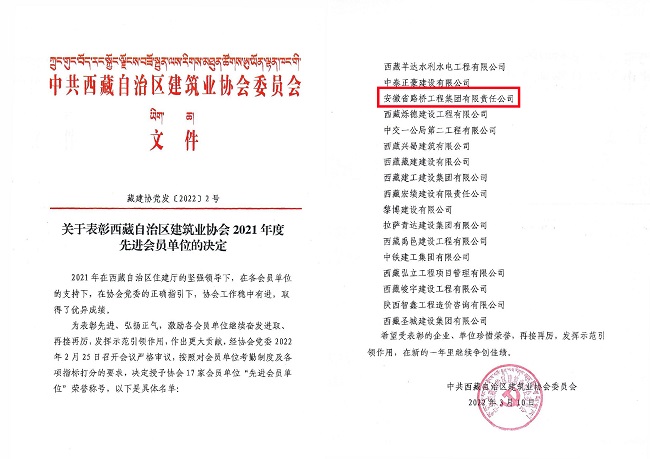 近日,西藏自治区建筑业协会党委下发文件,决定授予安徽省路桥工程集团有限责任公司“2021年度先进会员单位”荣誉称号。