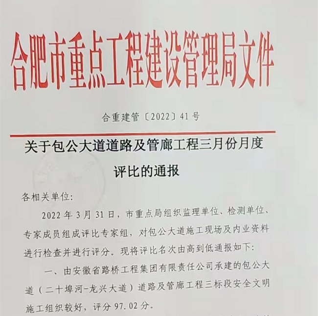 3月31日,合肥市重点工程建设管理局组织包公大道项目5个标段开展3月份月度评比,评比内容包括质量管理、安全管理、文明施工、内业资料、进度管理五个方面。安徽路桥集团包公大道03标段以总分97.02分喜获全线“第一名”的好成绩,其中,质量管理、文明管理、进度管理三项考核均为满分。