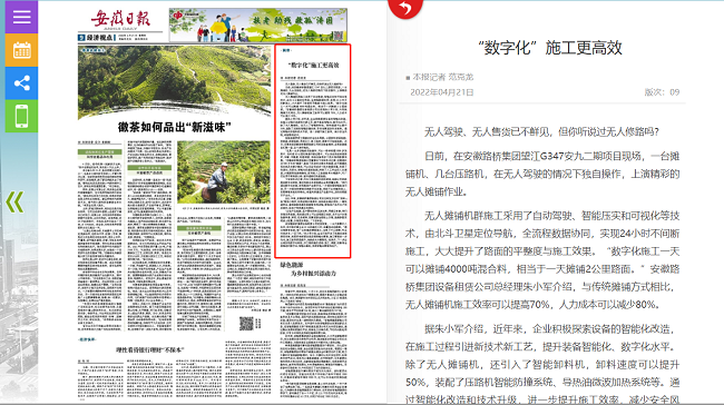 4月21日,《安徽日报》于09经济视点版以《“数字化”施工更高效》为题,聚焦安徽路桥集团在智能建造方面的探索与应用,重点介绍所属设备租赁公司无人摊铺技术、指挥官系统应用与检测公司检测装备“黑科技”、安路e检小程序等。