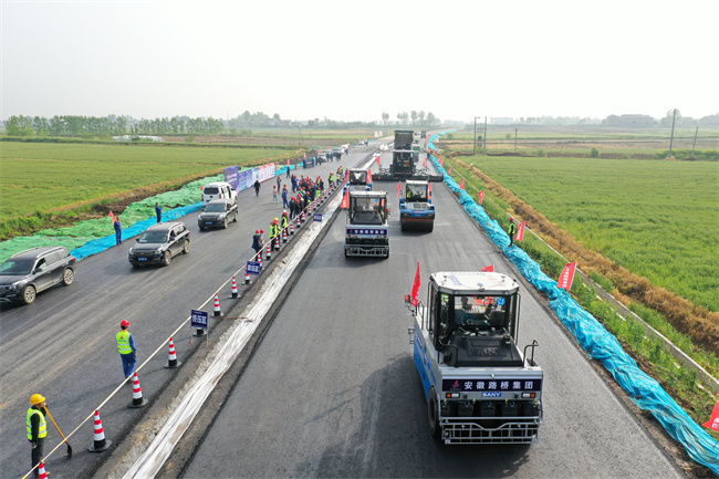 无人摊铺机群施工采用了自动驾驶、智能压实和可视化等技术,由北斗卫星定位导航,全流程数据协同,实现24小时不间断施工,大大提升了路面的平整度与施工效果。“数字化施工一天可以摊铺4000吨混合料,相当于一天摊铺2公里路面。”安徽路桥集团设备租赁公司总经理朱小军介绍,与传统摊铺方式相比,无人摊铺机施工效率可以提高70%,人力成本可以减少80%。