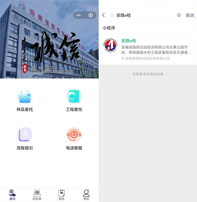 2021年底,安徽路桥集团检测公司自主研发并发布“安路e检”微信小程序,实现远程办理委托、在线签名确认回执、一键快递样品、查询检测进度及检测报告等功能,帮助客户足不出户完成委托,给客户带来真正的便利。