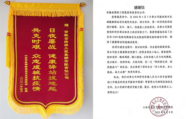 锦旗和感谢信是荣誉,更是激励。路桥集团将继续发扬优良作风,始终保持奋进之姿,以实际行动为六安市疫情防控和城市建设作出更大的贡献。