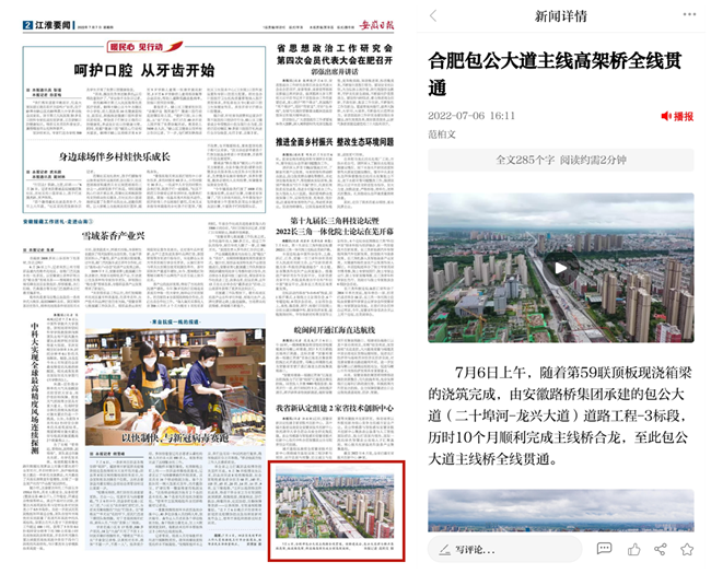 随后,学习强国、人民网、央广网、《安徽日报》、中安在线、《市场星报》、《合肥晚报》、《新安晚报》、安徽网等一批主流媒体重点报道路桥集团建设成果,网易、新浪、腾讯等平台对稿件积极转载。