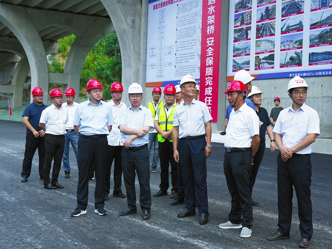 8月11日,安徽省交通控股集团建设管理有限公司“提升管理效能、决胜全年目标任务”工作推进会在歙县召开,会议期间,会务组组织全省在建高速公路项目办负责人赴安徽路桥集团黄千02标项目武阳互通观摩交流。省交控集团总经理助理、建设公司党委书记、总经理黄学文等领导以及各项目办负责人等近50人参加观摩,安徽路桥集团党委书记、董事长任杰,党委委员、副总经理、总工程师陈莘,党委委员、副总经理江仲明出席观摩活动。