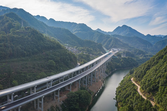 此次观摩学习点傍山桥,位于大洲源北岸典型傍山陡坡沿河路段狭窄走廊带,采用装配式悬挑路基结构为全国首创。设计2处装配式悬挑结构及37个宽翼展花瓶墩结构,与右半幅形成高低分离式叠合路基,施工工艺新颖,技术复杂,难度大。