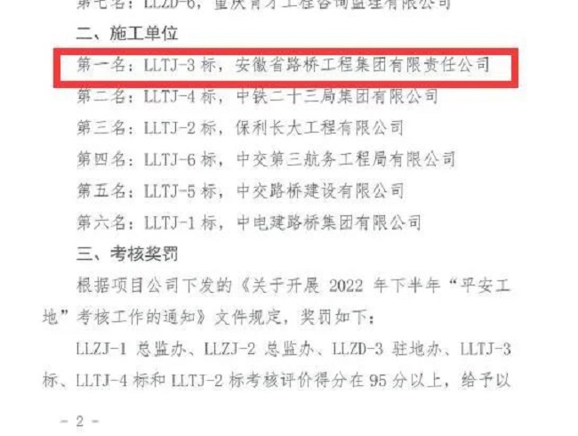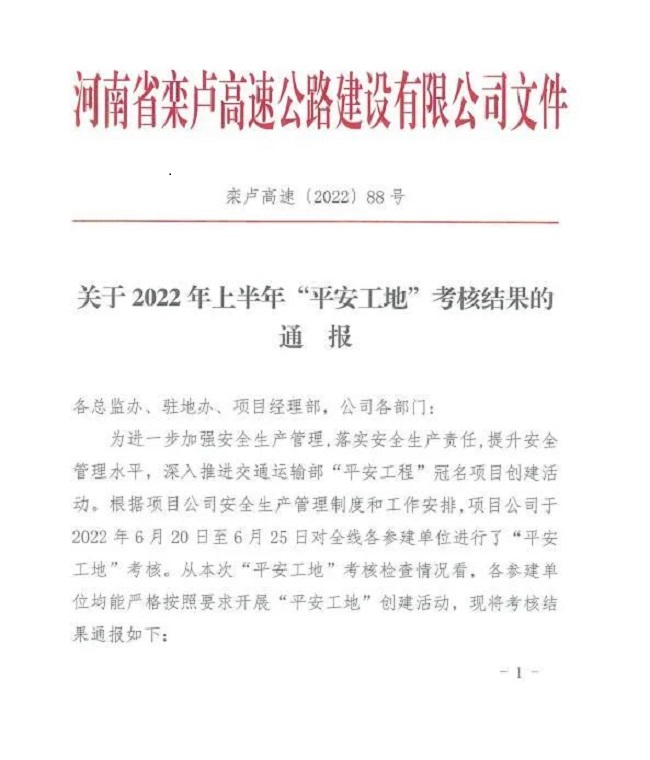 近日,河南省栾卢高速建设有限公司组织栾卢高速项目6个标段开展2022年上半年平安工地考核,安徽路桥集团栾卢高速03标段喜获全线“第一名”的傲人成绩,有力彰显了公司企业形象。