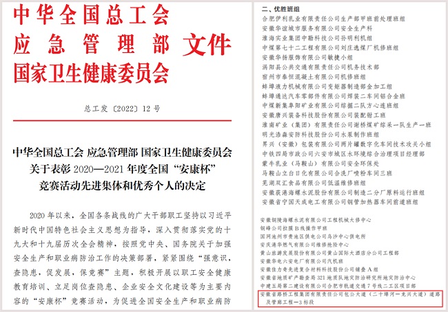 近日,中华全国总工会、应急管理部、国家卫生健康委员会联合发文《关于表彰2020-2021年度全国安康杯竞赛活动先进集体和优秀个人的决定》,安徽路桥集团包公大道(二十埠河-龙兴大道)道路及管廊工程-3标项目荣获2020-2021年度全国“安康杯”竞赛活动优胜班组荣誉称号,这是公司首次获该项国家级荣誉。