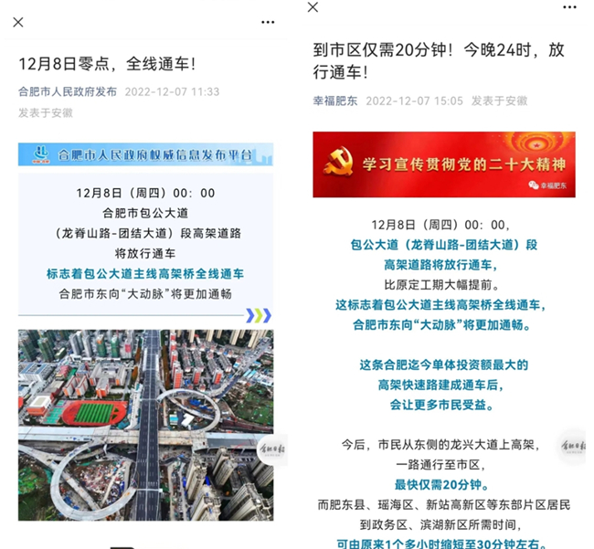 “合肥市人民政府发布”、“幸福肥东”、《合肥日报》、《安徽商报》等官方政务微信号、官方微信号对路桥集团建设成果予以报道展现。